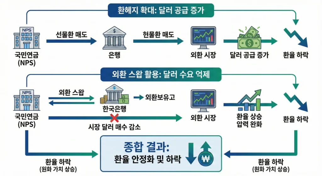 국민연금 (선물환 매도) ➔ 은행 (포지션 조정을 위해 달러 매도) ➔ 외환 시장 (달러 공급 증가) ➔ 📉 환율 하락