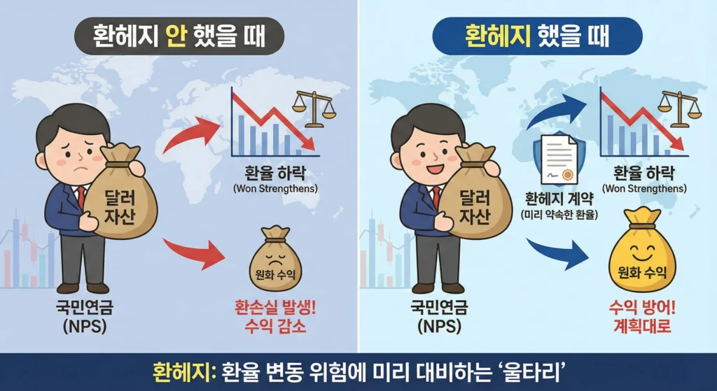 | 국민연금 수익률 측면 | 환율이 하락할 경우 환차손 방어 (자산 가치 보존) | 환율이 계속 오를 경우 막대한 환차익 포기 (기회비용 발생) |