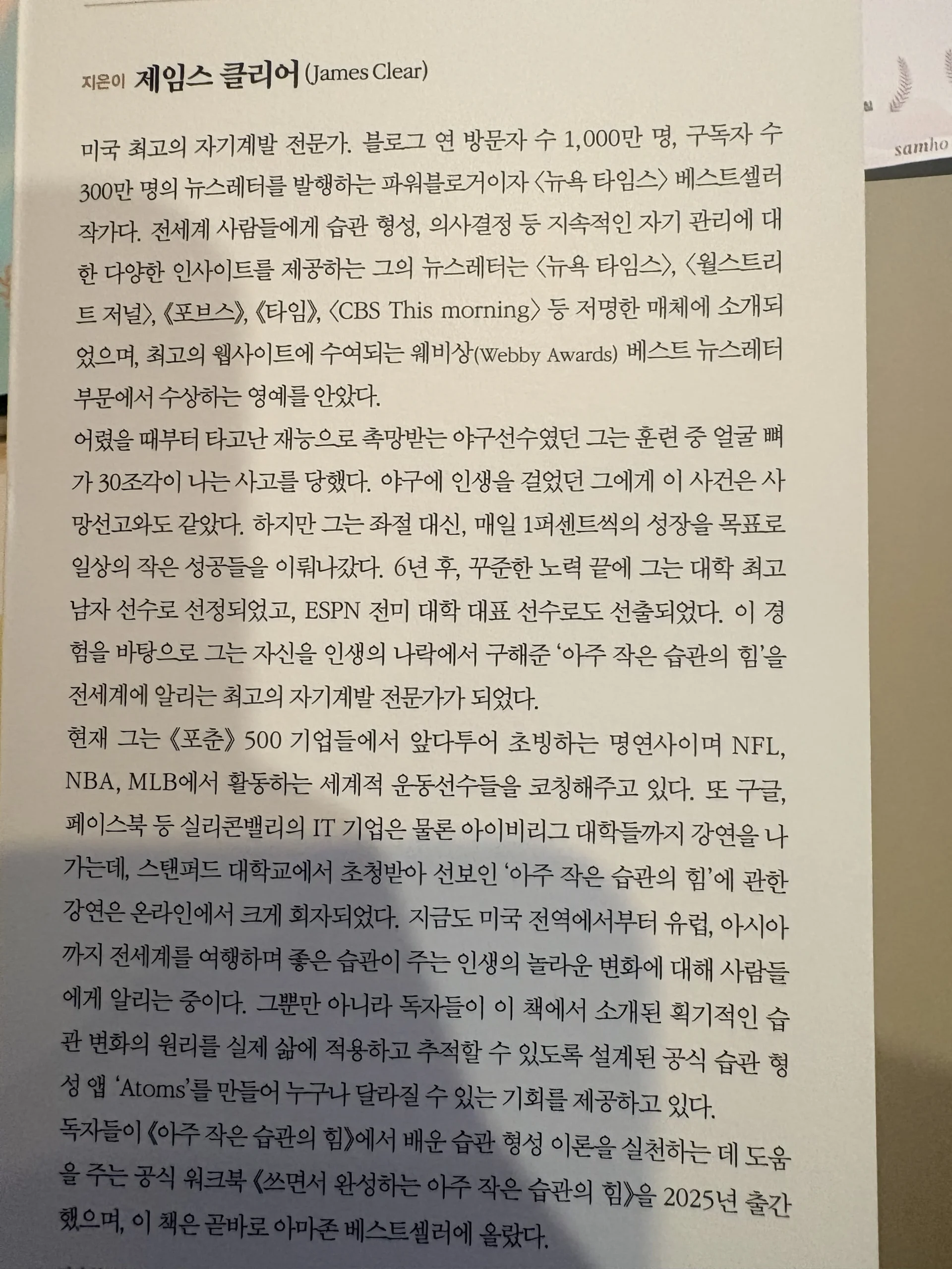 제임스 클리어의 베스트셀러 《아주 작은 습관의 힘(Atomic Habits)》은 작은 변화들이 어떻게 쌓여 놀라운 결과를 만들어내는지에 대한 과학적이고 실용적인 가이드입니다.