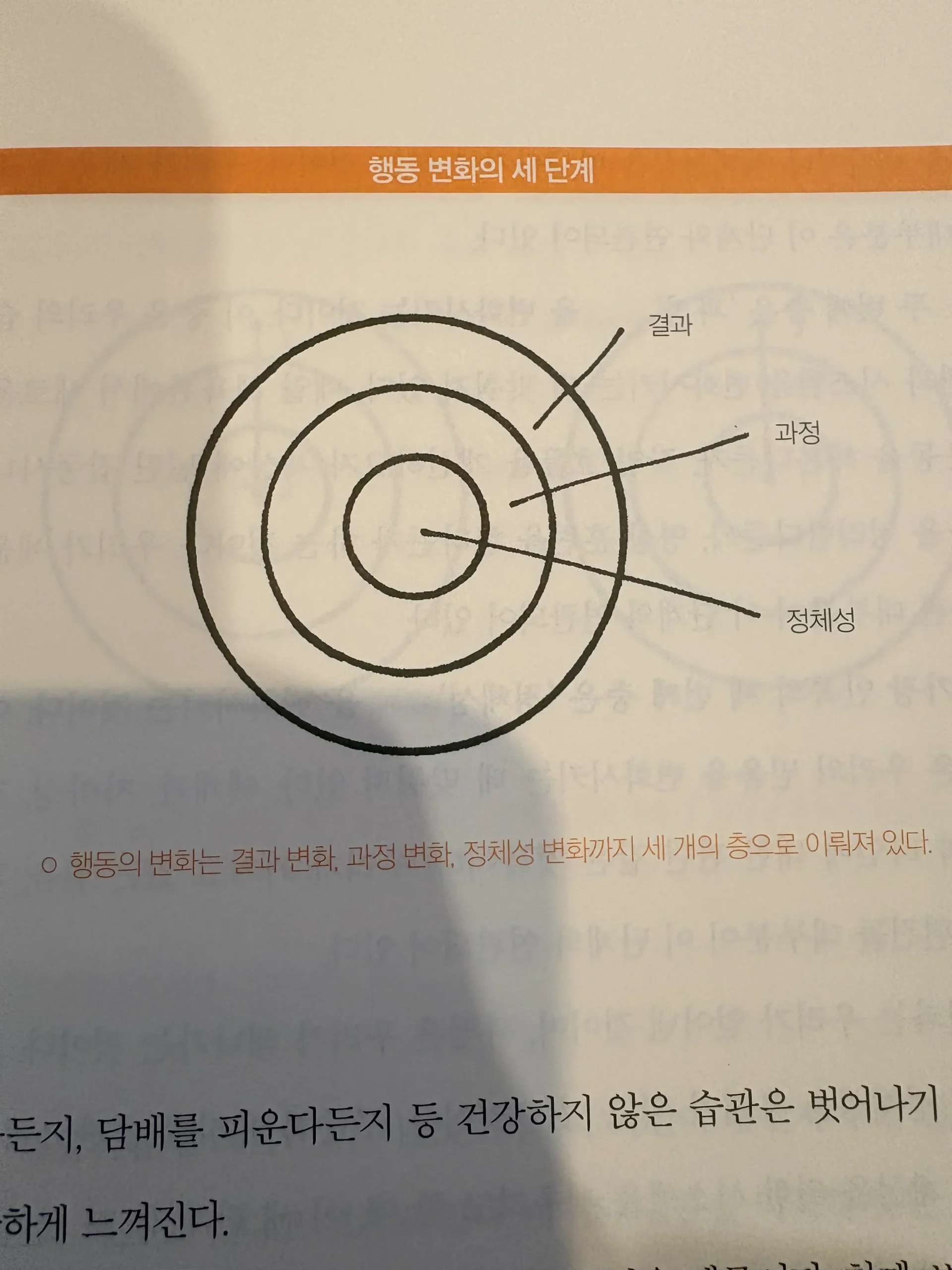 습관을 바꾸기 어려운 이유는 두 가지입니다. 변화시키고자 하는 대상이 잘못되었거나, 변화의 방식이 잘못되었기 때문입니다. 행동 변화는 세 겹의 양파와 같습니다. 가장 바깥쪽은 ‘결과(살 빼기)’, 중간은 ‘과정(운동하기)’, 가장 안쪽은 ‘정체성(믿음)’입니다.